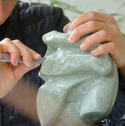 Je les modèle, les laisse sécher, les taille au couteau, puis, les ponce et les polis.